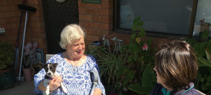 “I look forward to Wednesdays,” says Mercy Health home care client Ruth Johnson from her unit in Young, New South Wales, where one of her three rescue dogs is curled up in her lap. The youngest, Alfie, barks excitedly in the background.