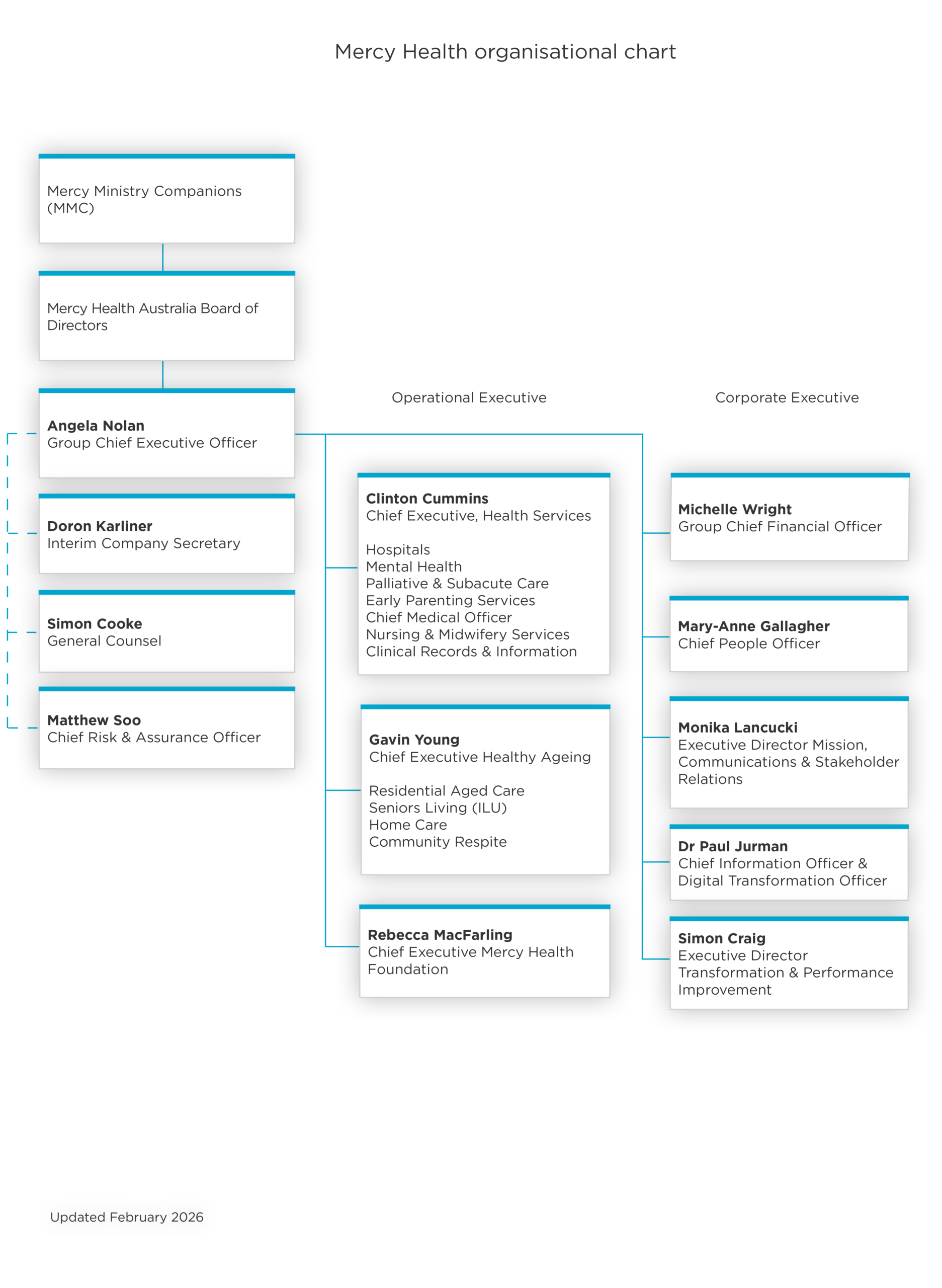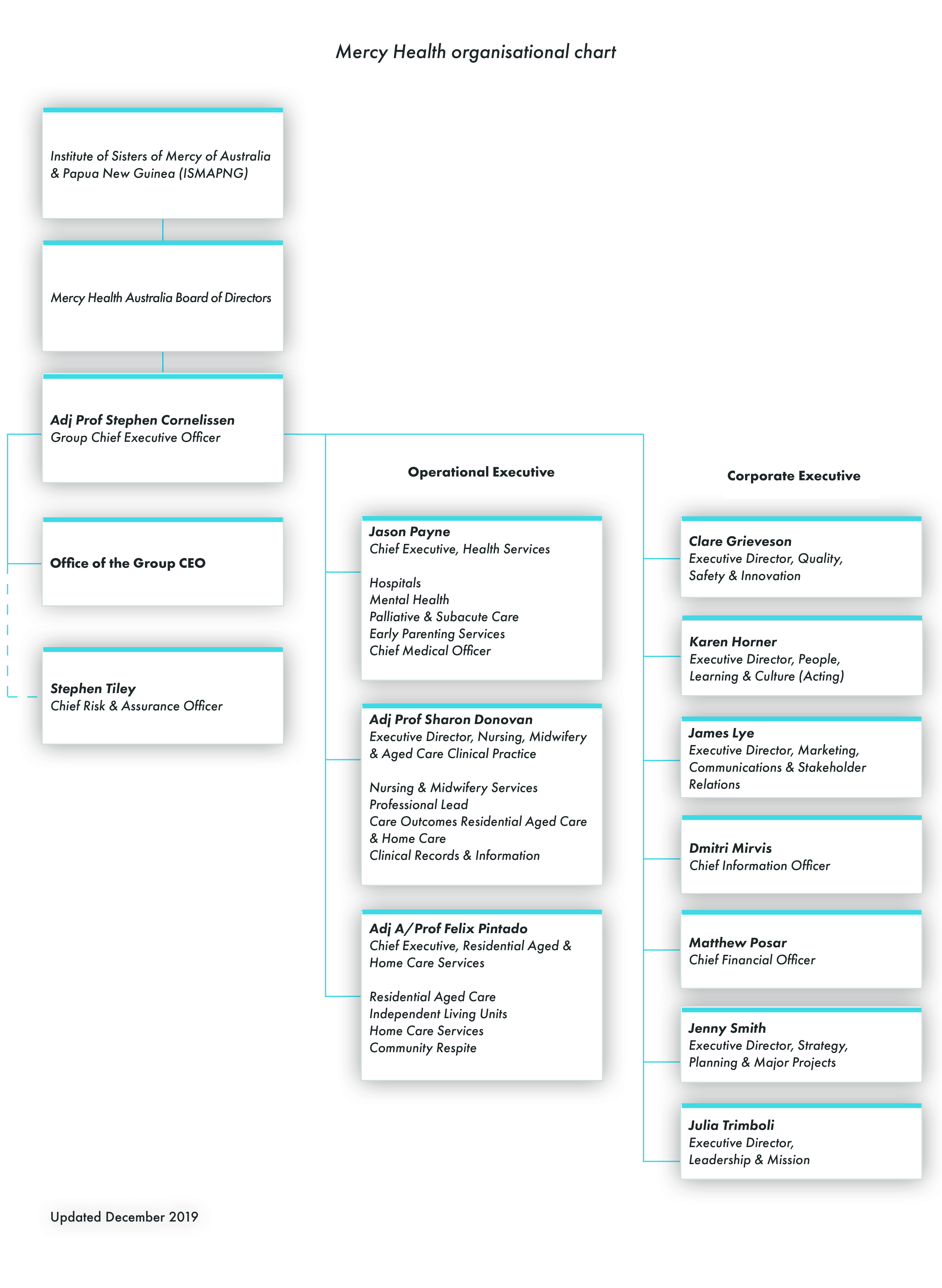 Mercy Health is a ministry of the Institute of Sisters of Mercy of Australia and Papua New Guinea (ISMAPNG) and is governed by the concurrent Mercy Health Boards. Our organisation is structured to ensure a commitment to our values, and the best possible care for people in need.